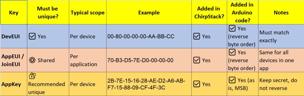 - DevEUI and AppEUI must be in LSB format (reverse order from ChirpStack).